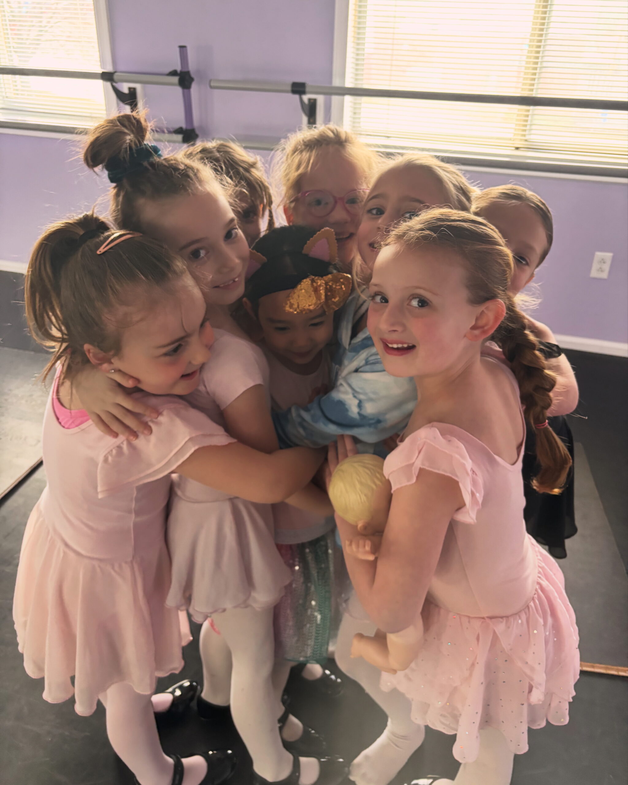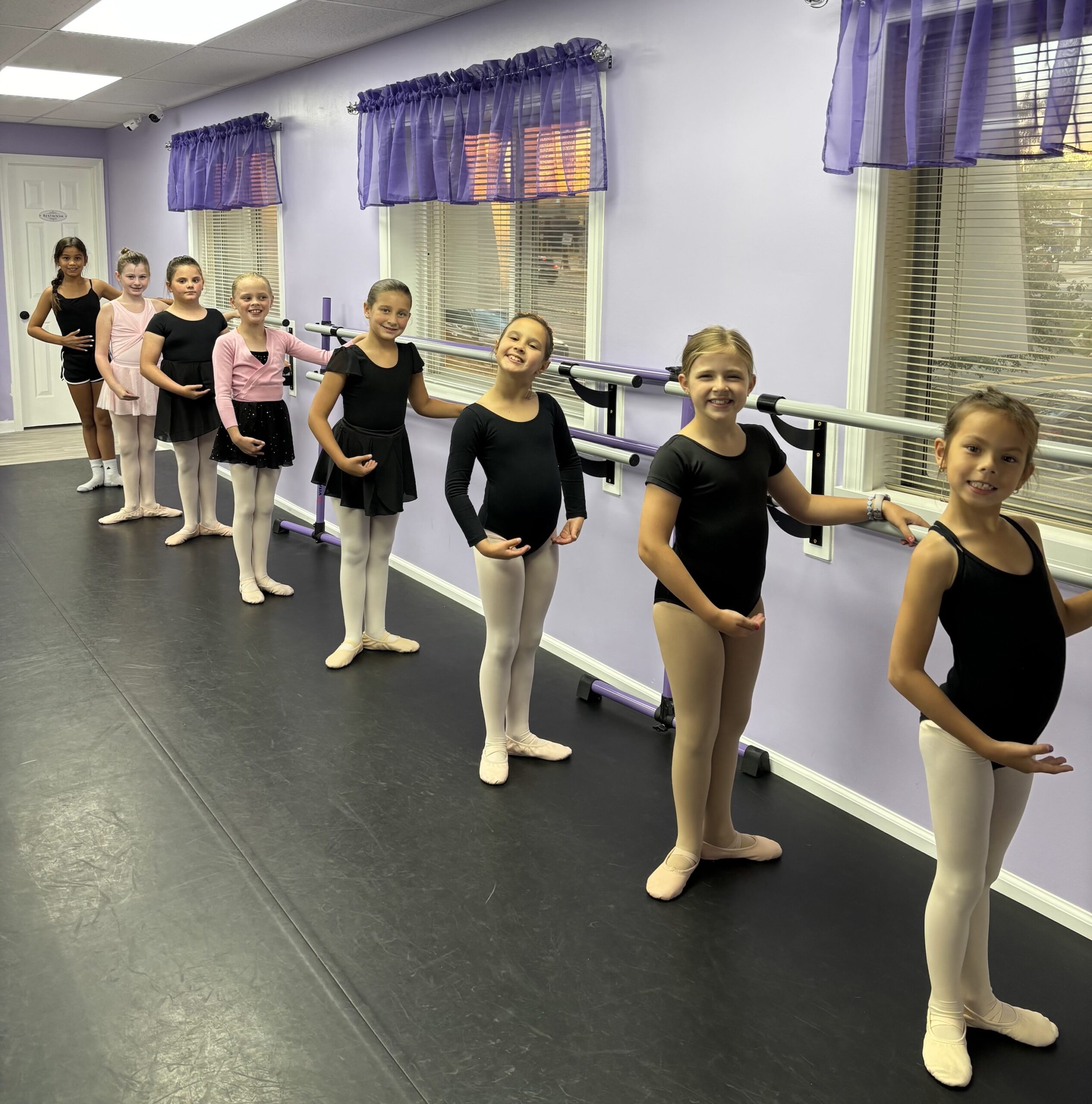 Students are expected to be able to use the restroom by him/herself and dress themselves (girls wear a leotard and tights), but restroom use should take place before class, not during. We do understand there are emergencies sometimes where they may have to go during class, so all students must be potty trained and able to use the restroom on their own.